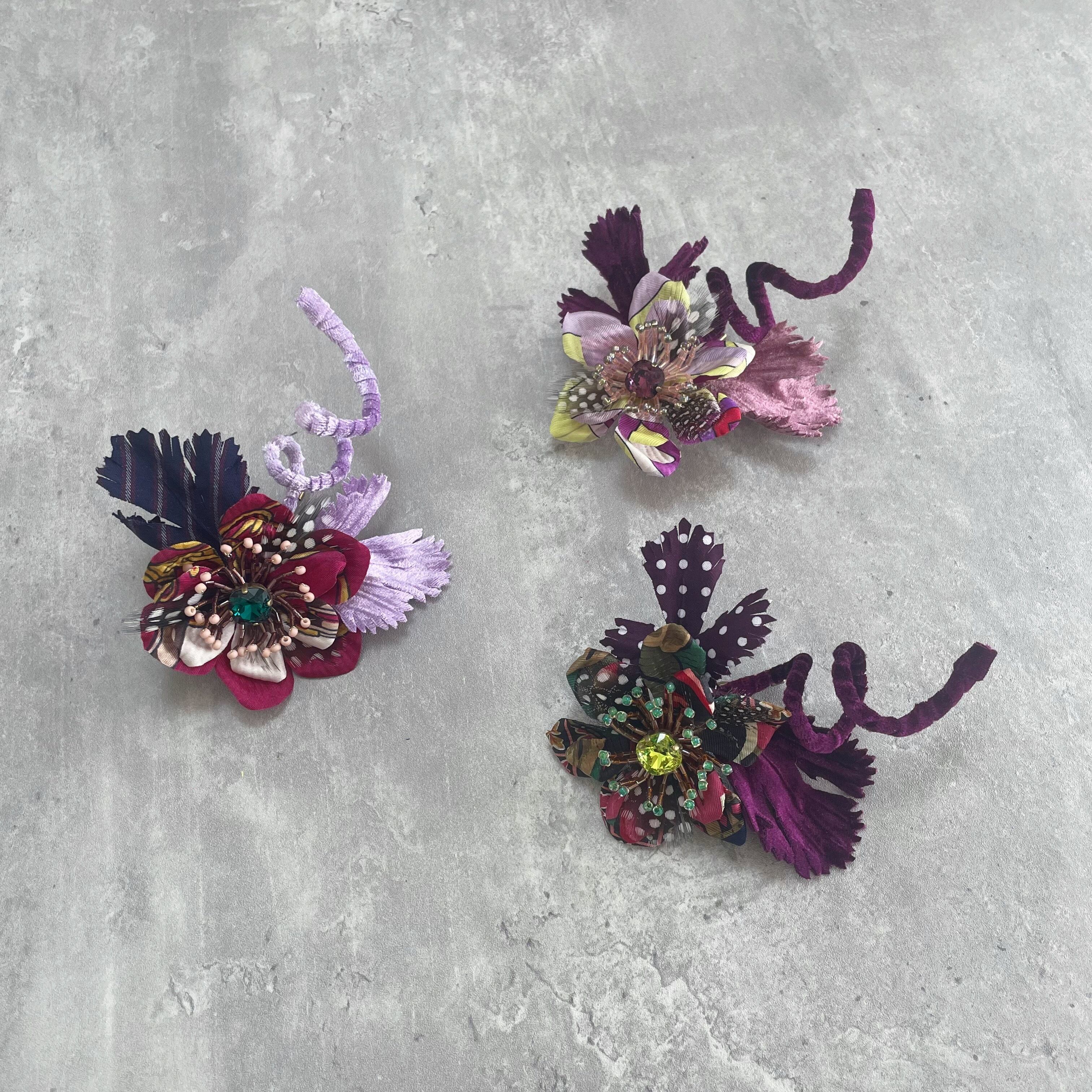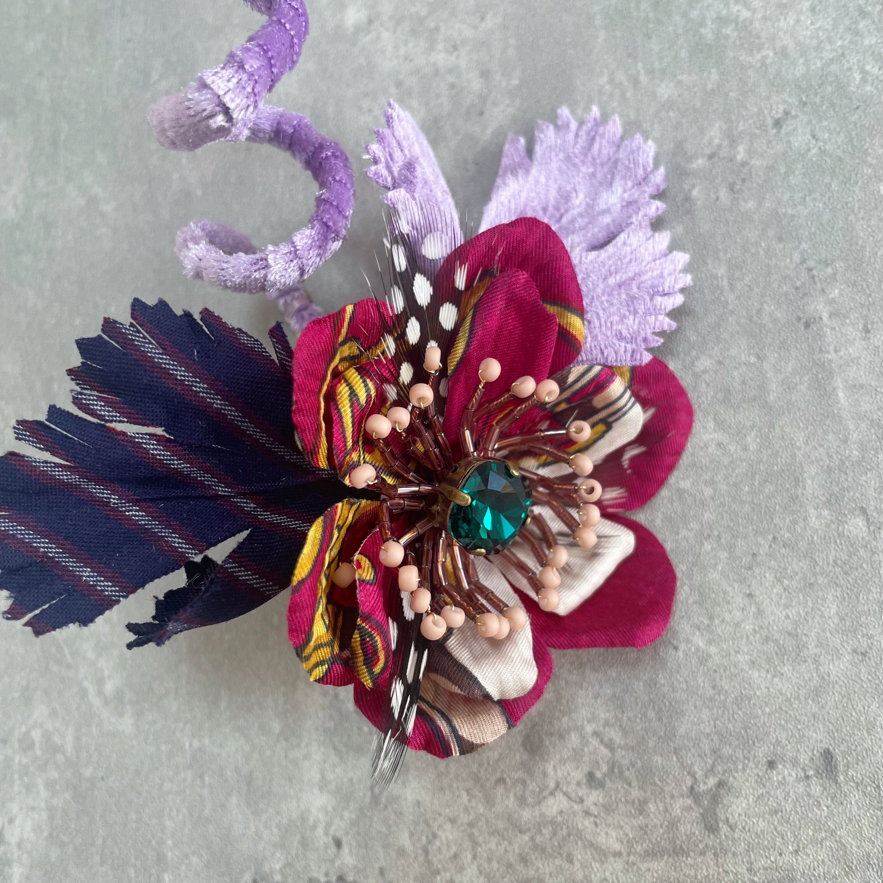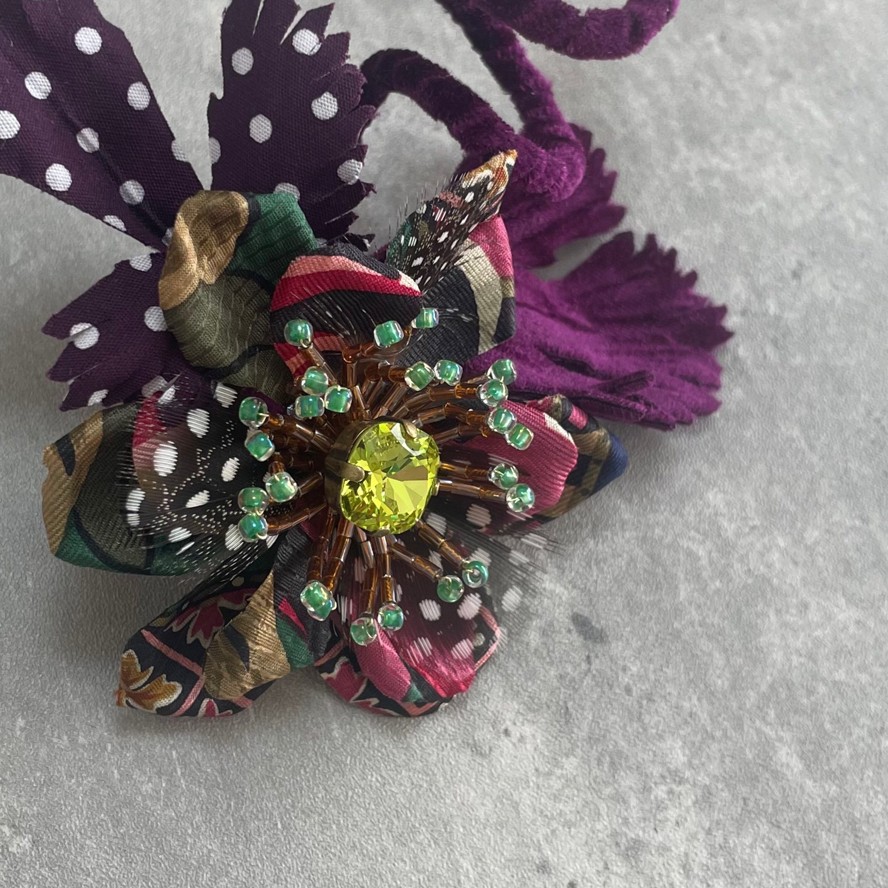 葉と茎は、古布とベロア素材です。中にワイヤーを通して自由に曲げられる為、着用時に花、葉、茎の向きの調節も可能となっています。
